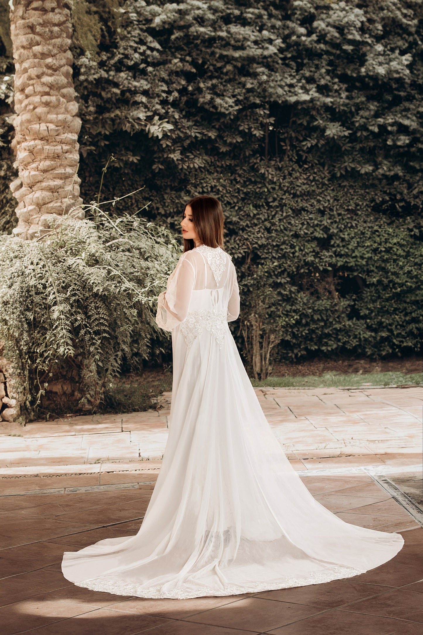 Robe is beaded lace top, V back, waistline. Skirt is two layered tulle with beaded laced hem.